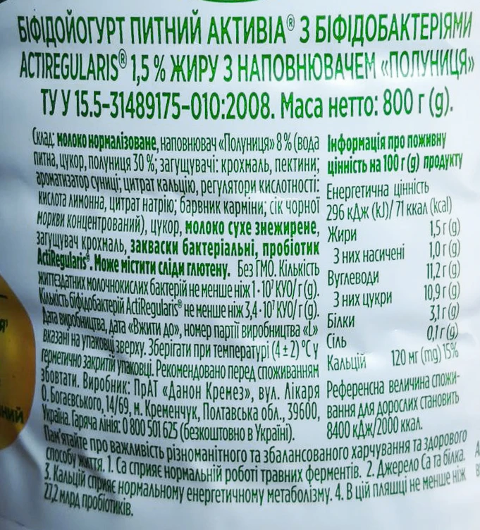 - Активіа Біфідойогурт 1.5% Полуниця 800г