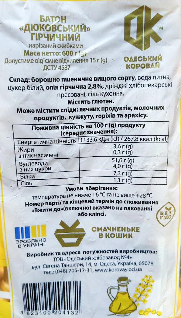 - Батон Одеський хлібозавод №4 «Дюковський» пшеничний гірчичний нарізний, 600 г