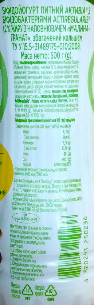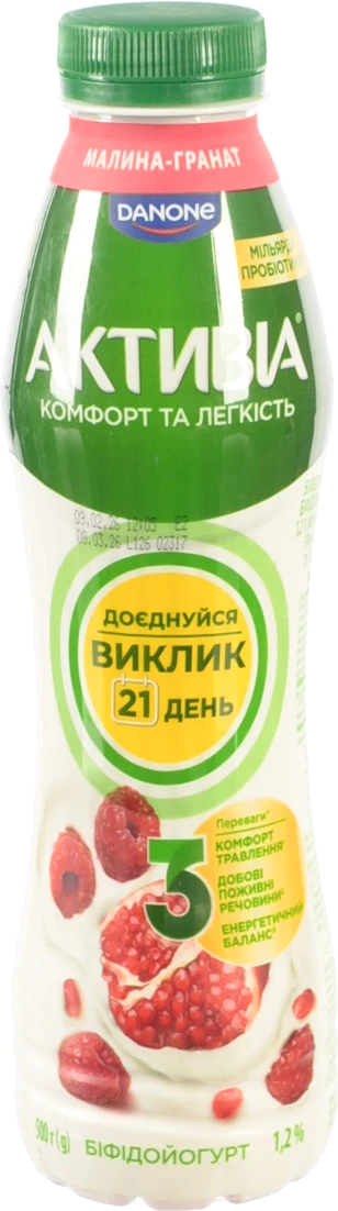 - Біфідойогурт Активіа 500г 1.2 малина гранат пет
