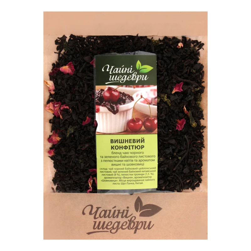 - Чай чорний та зелений байховий листовий з пелюстками квітів та ароматом вишні та шовковиці Вишневий конфітюр Чайні шедеври кг