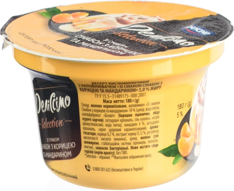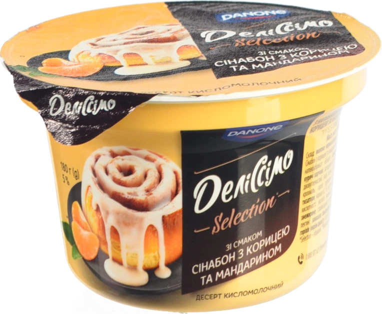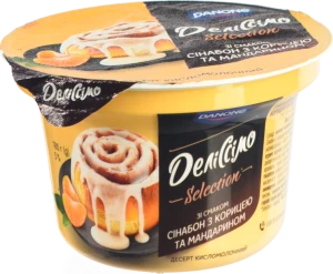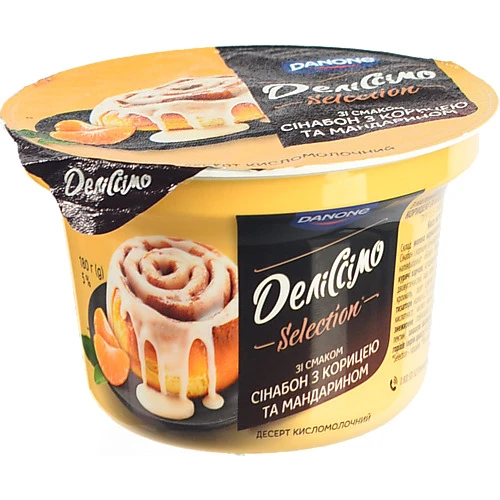 - Десерт кисломолочний 5% з наповнювачем Зі смаком сінабон з корицею та мандарином Деліссімо Selection Danone ст 180г
