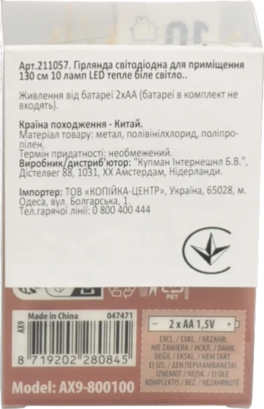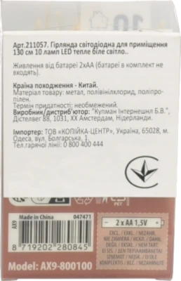 - Гірлянда світодіодна 130см 10 ламп LED теплий білий