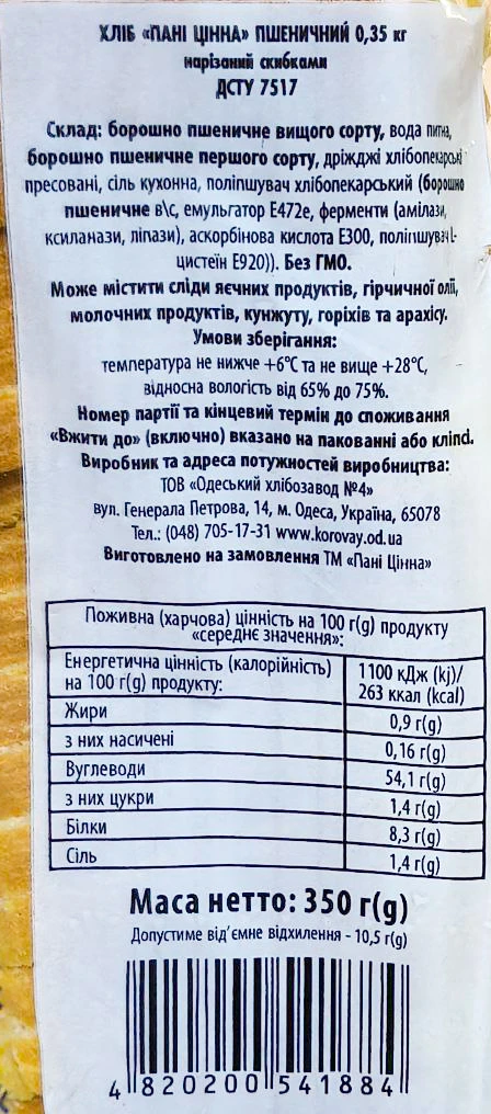 - Хліб «Пані Цінна» «Пшеничний», нарізний, 350 г
