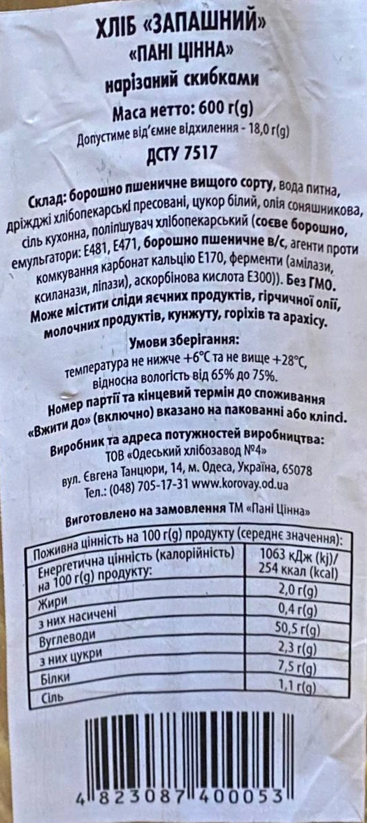- Хліб «Пані Цінна» «Запашний» нарізний, 600 г
