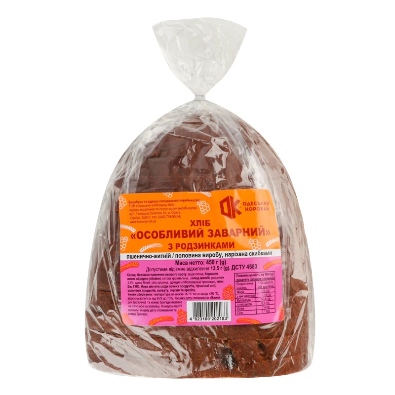 - Хліб Одеський хлібозавод №4 Особливий заварний з родзинками житньо-пшеничний нарізний, 450 г