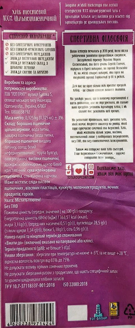 - Хліб «Тостовий Цільнопшеничний» від ТМ «Хлібний Будиночок», нарізаний, 325 г