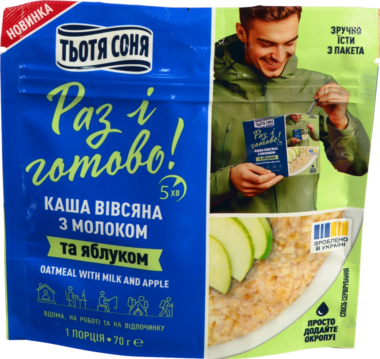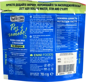 - Каша вівсяна з молоком та яблуком миттєвого приготування ТМ Тьотя Соня Aunt Sonya 70 г пакет
