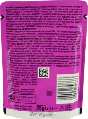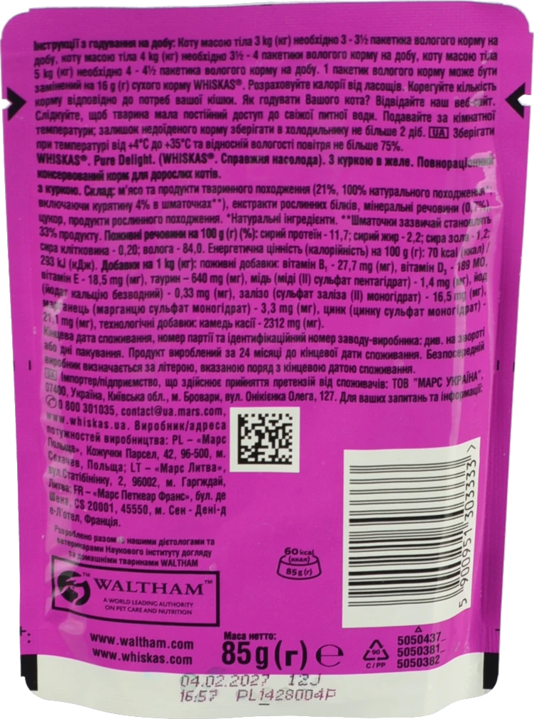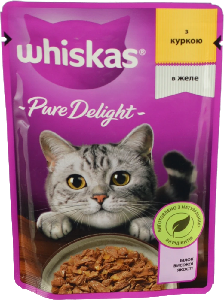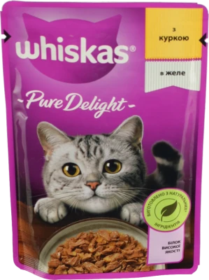 - Корм консервований для дорослих котів Whiskas Pure Delight з куркою в желе 85г