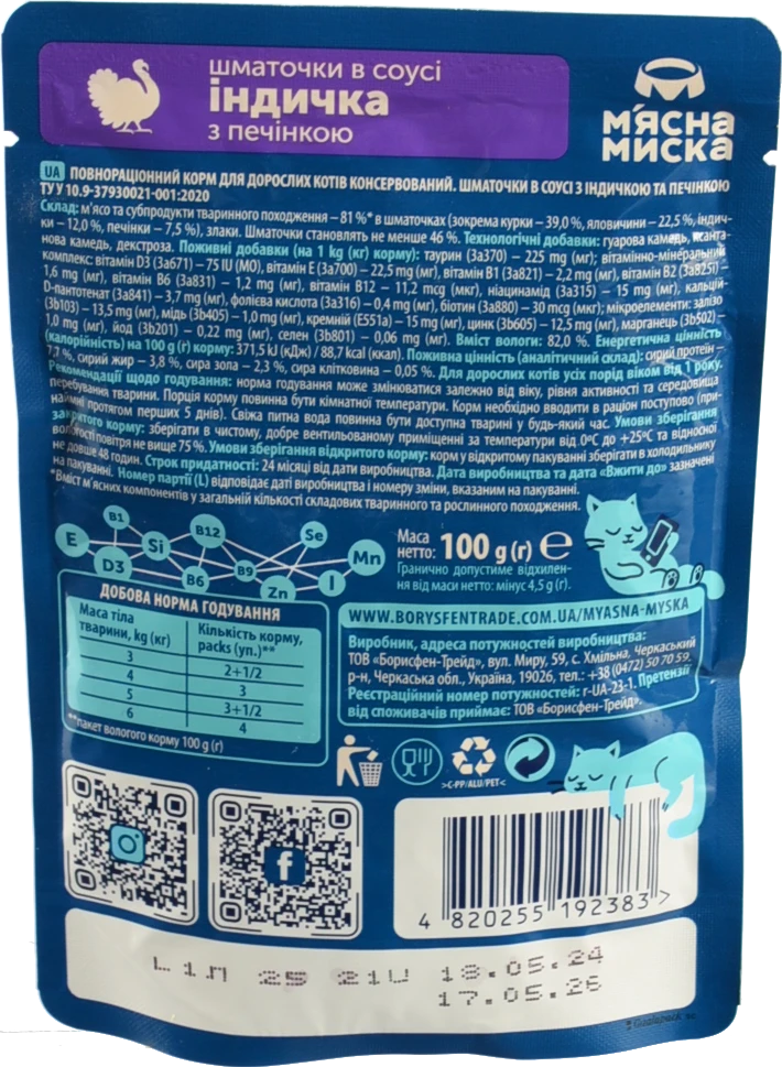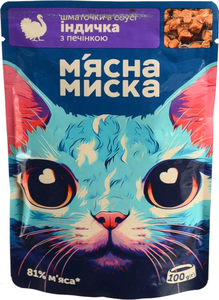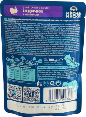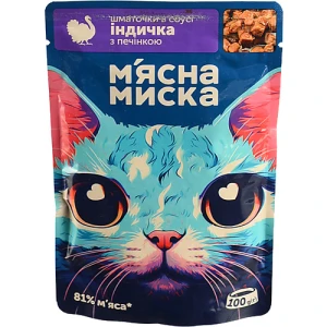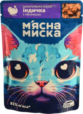 - Корм консервований повнораціонний для дорослих котів Індичка з печінкою Шматочки в соусі М'ясна Миска д/п 100г