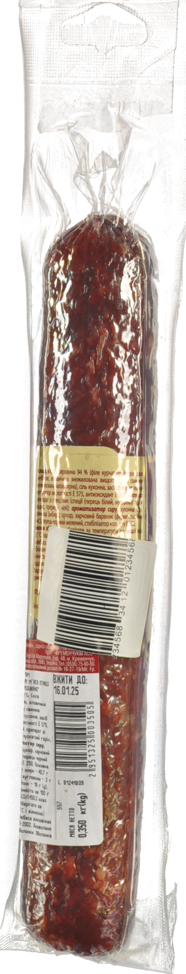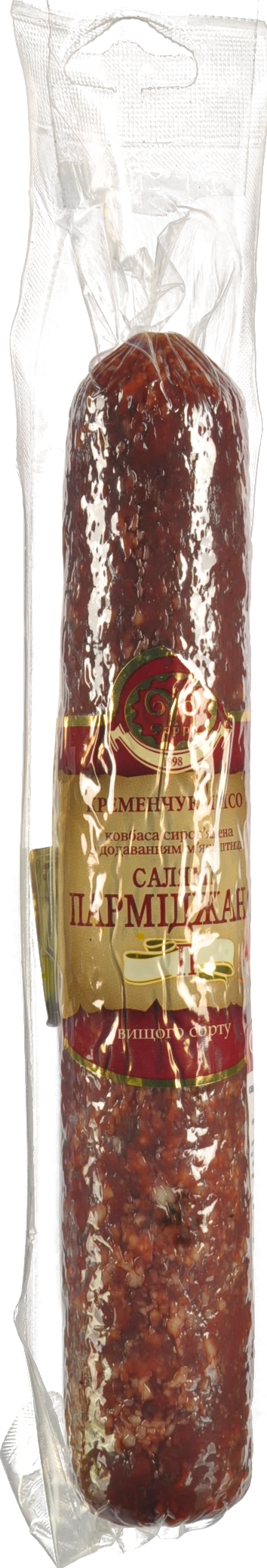 - Ковбаса «Салямі Парміджано» сиров’ялена з додаванням м’яса птиці, вищий ґатунок, вакуумна упаковка