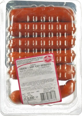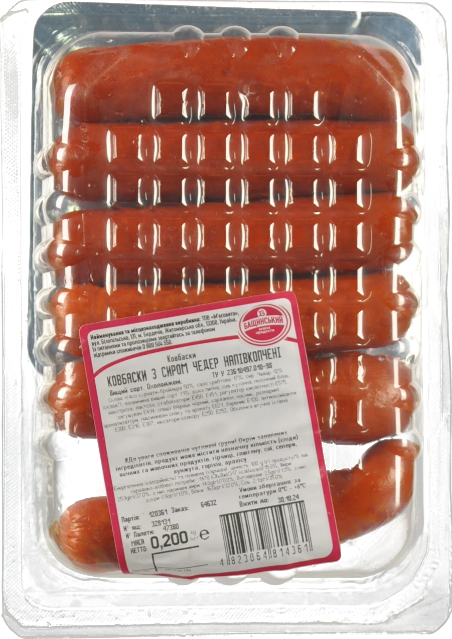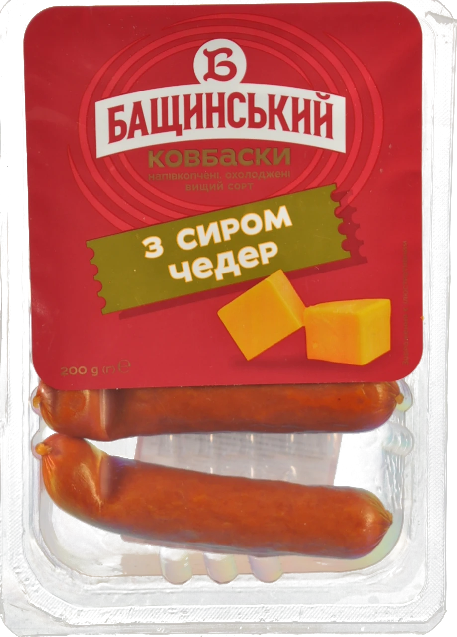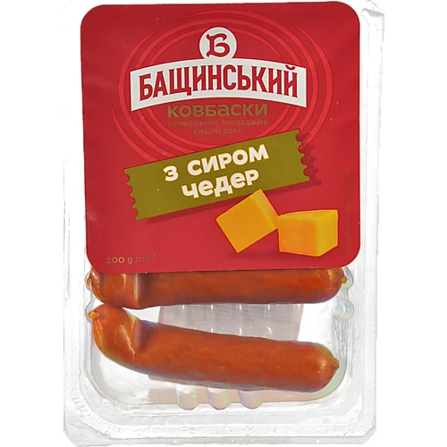 - Ковбаски Бащинський з сиром Чеддер напівкопчені вищий ґатунок, 200 г