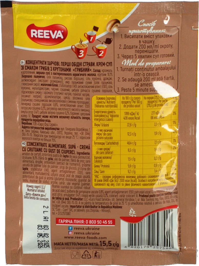 - Крем-суп Reeva зі смаком грибів з крутонами 15.5г