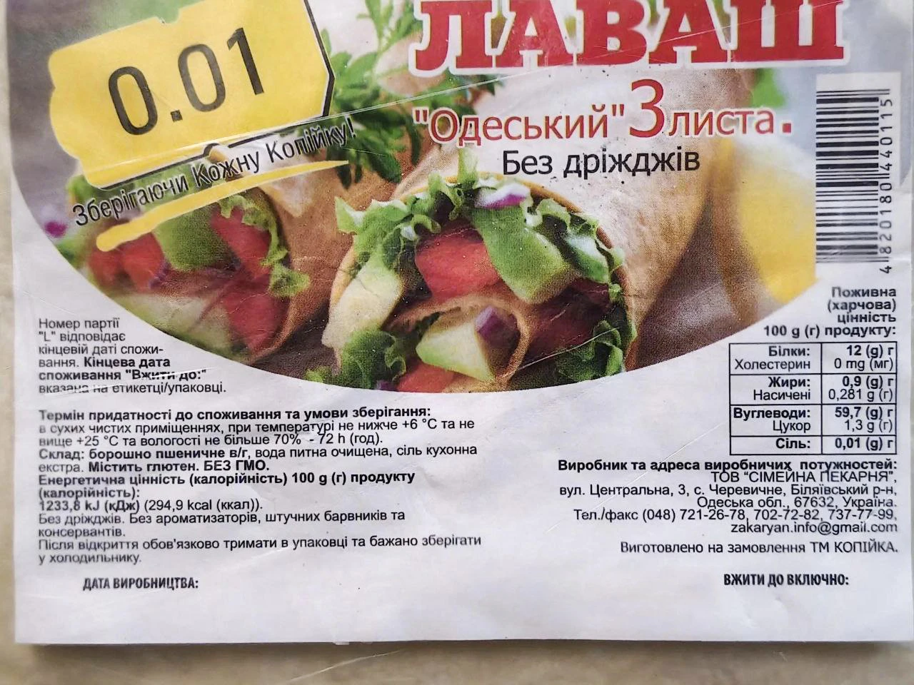 - Лаваш 0,01 «Одеський» 3 листи, 250 г
