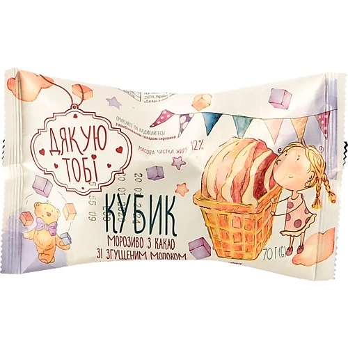 - Морозиво 12% з какао зі згущеним молоком в вафельному стаканчику Кубик Дякую Тобі м/у 70г