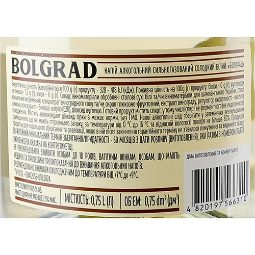 - Напій алкогольний сильногазований солодкий білий «БОЛГРАД», 0.75 л