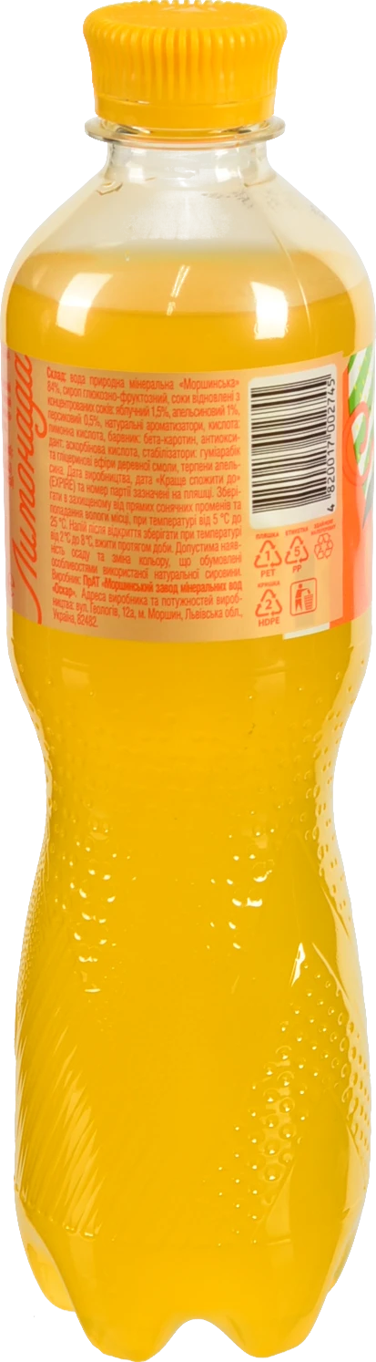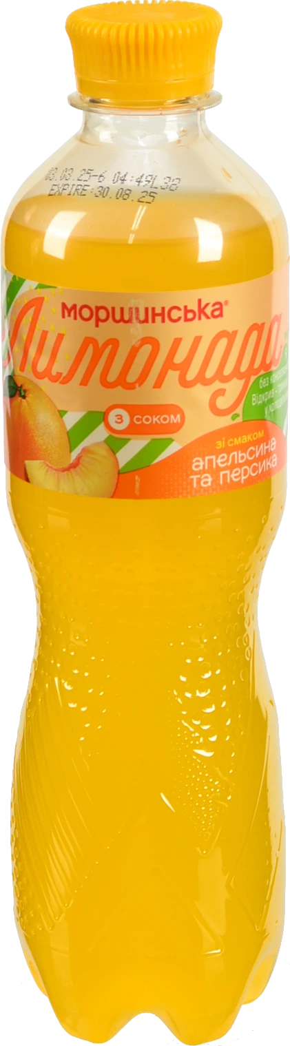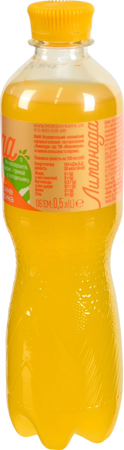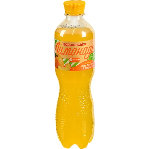 - Напій безалкогольний соковмісний середньогазований зі смаком апельсина та персика Лимонада Моршинська п/пл 0.5л