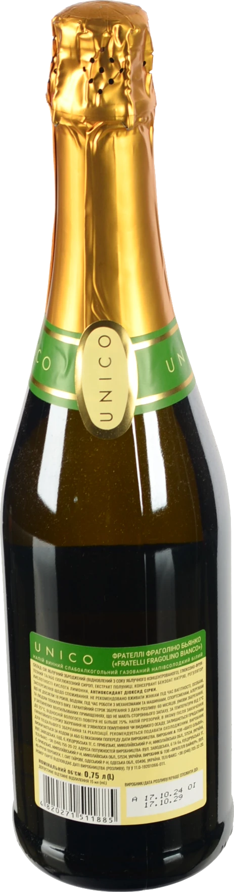 - Напiй винний Unico 0.75л фрателлі фраголіно бьянко білий н.сол газ