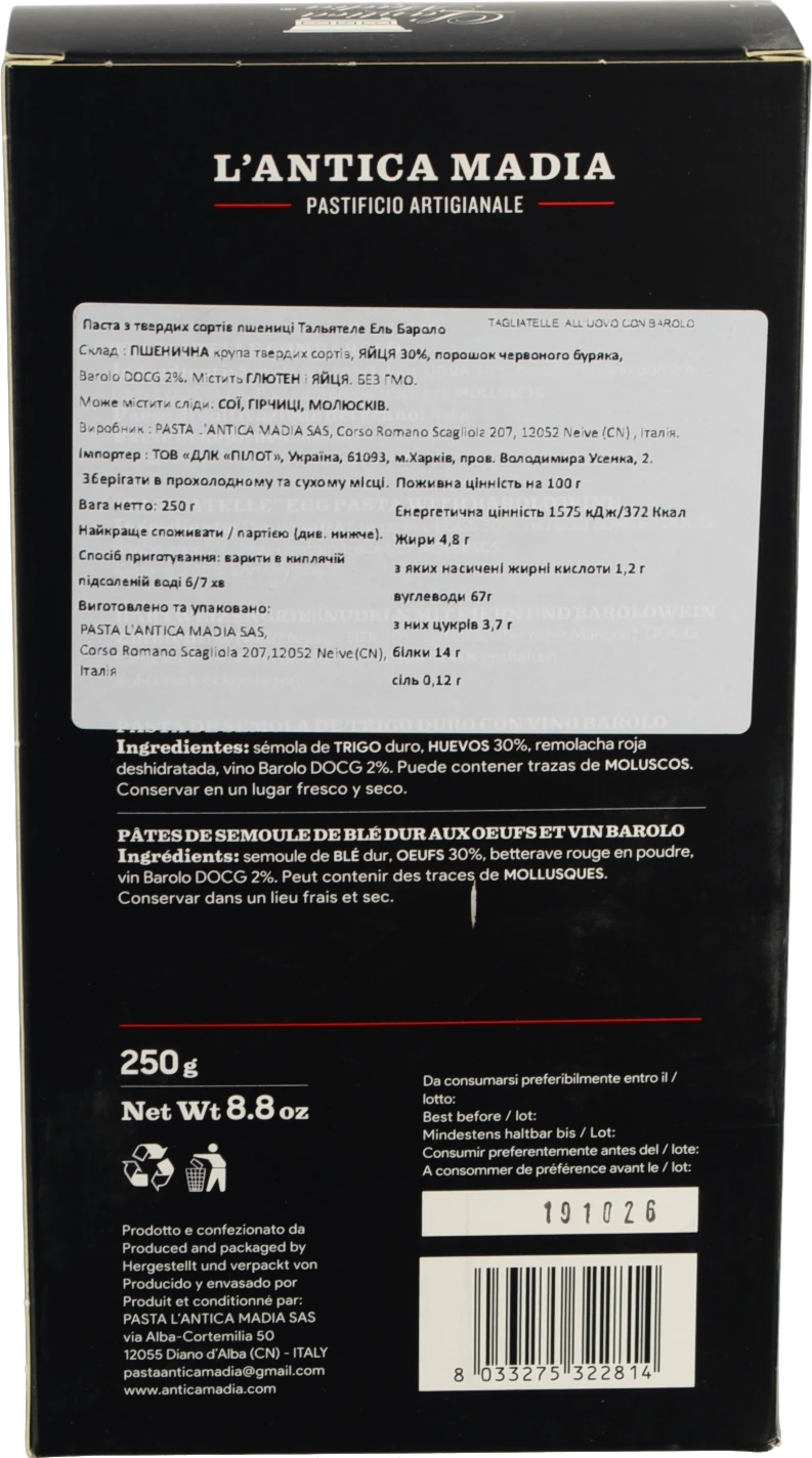- Паста Lantica Madia 250г яєчна Tagliatelle з вином Barolo