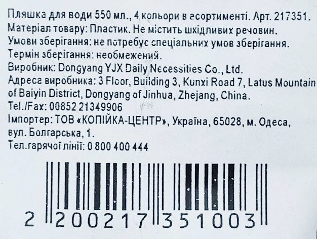 - Пляшка для води 550 мл 4 кольори в асортименті