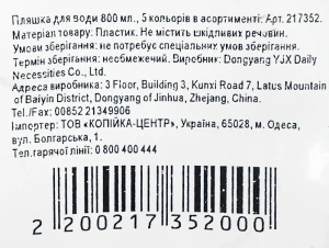 - Пляшка для води 800 мл 5 кольорів в асортименті