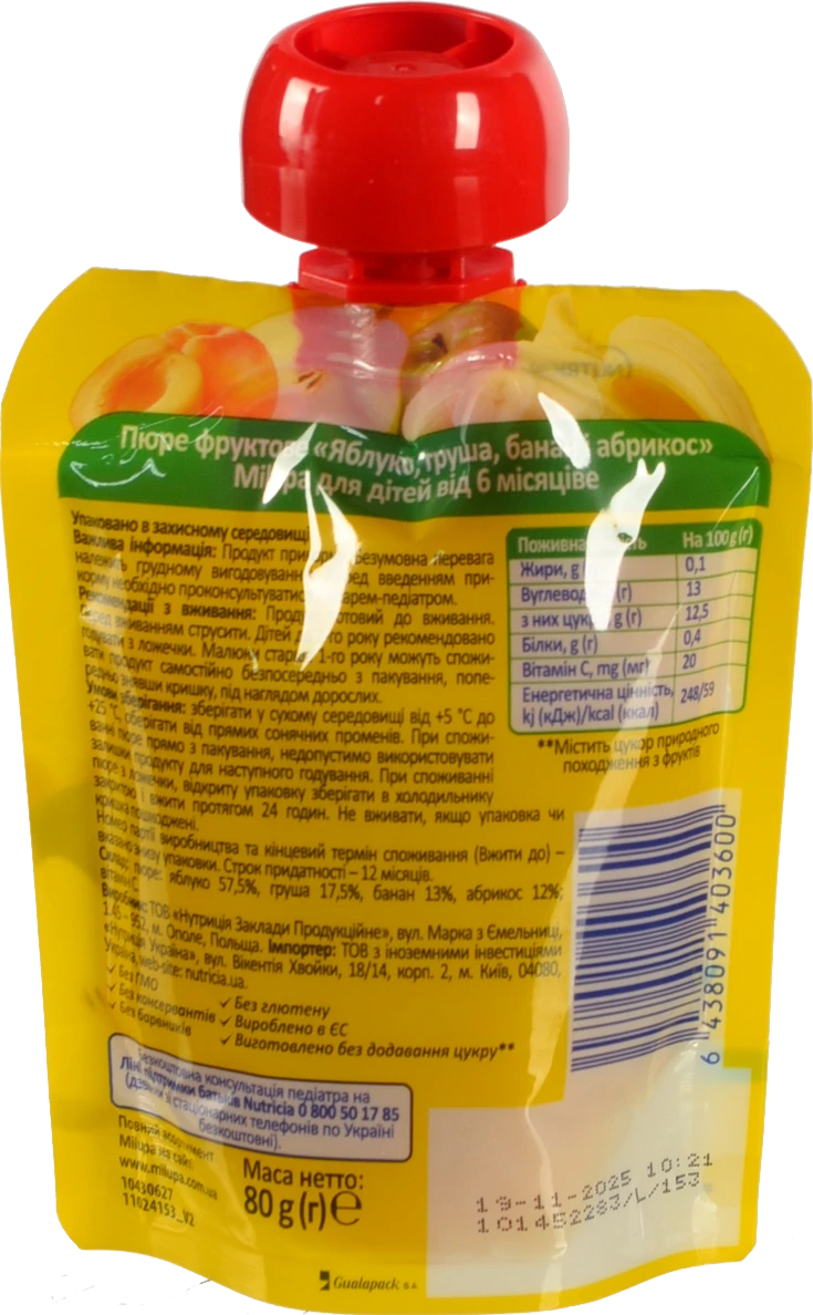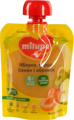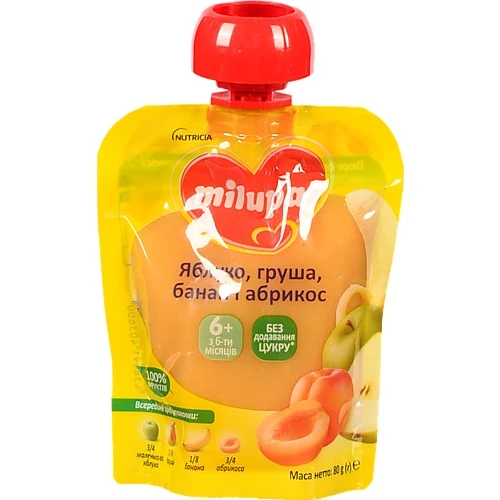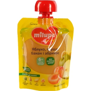 Пюре для дітей від 6міс фруктове Яблуко-груша-банан-абрикос Milupa д/п 80г