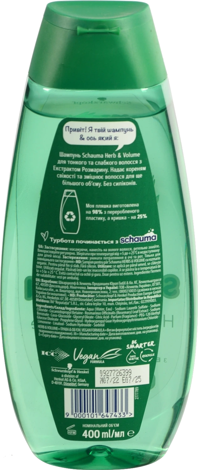 - Шампунь для волосся з екстрактом розмарину Herb&Volume Schauma 400мл
