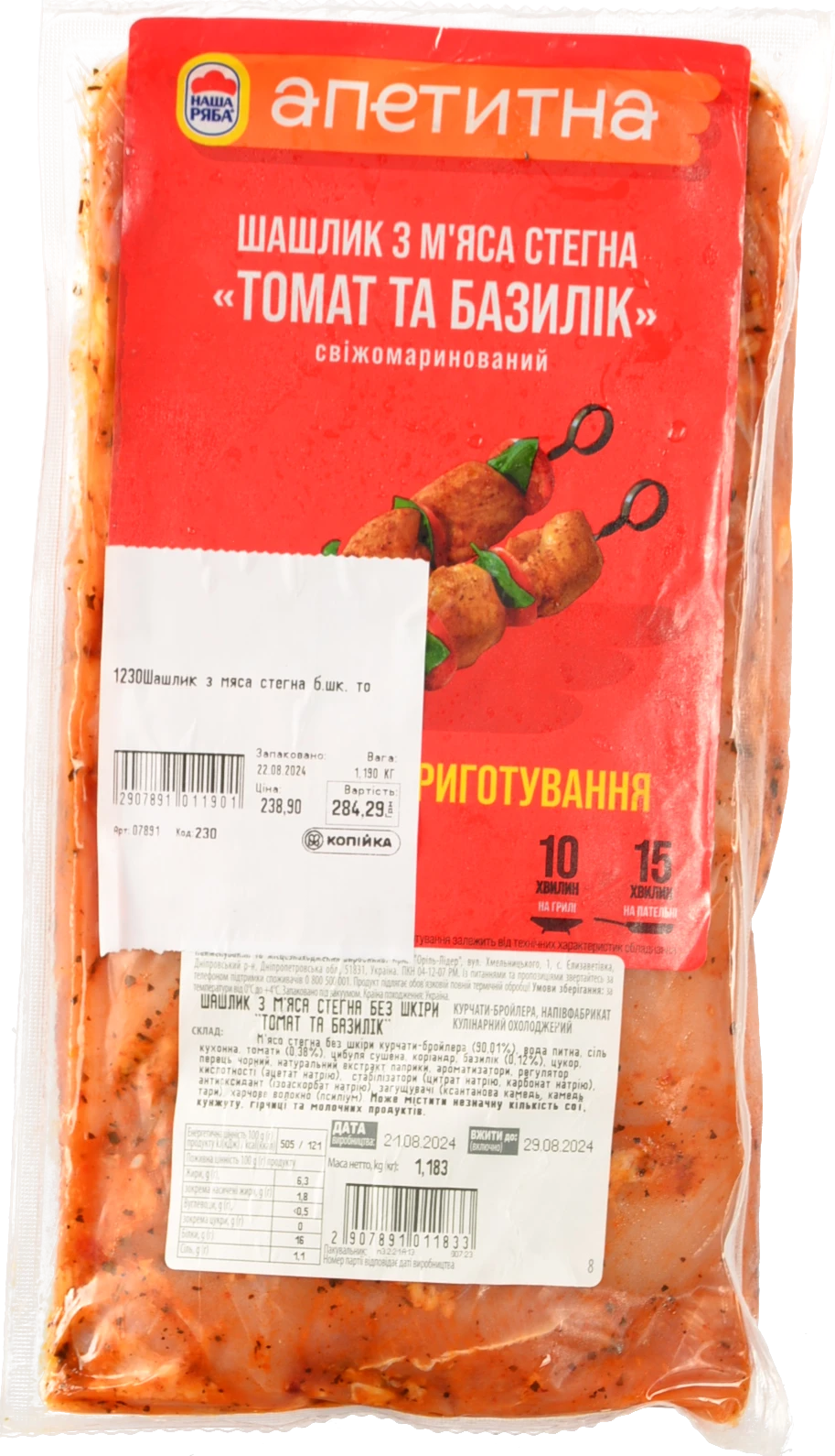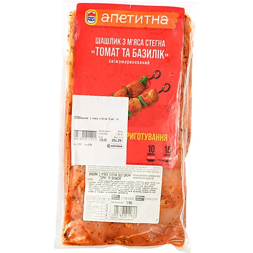 - Шашлик з м’яса стегна Наша Ряба Апетитна Томат та базилік без шкіри охолоджений