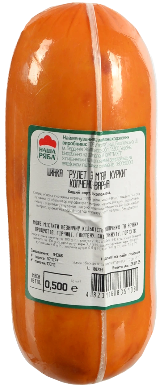 - Шинка Рулет з м'яса курки Наша ряба в/к охол в/с в/у 0.5кг