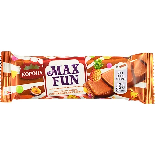 - Шоколад молочний Манго-ананас-маракуйя-іскриста карамель-шипучі кульки Max Fun Корона м/у 38г