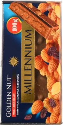 - Шоколад молочний з цілим мигдалем та родзинками Golden Nut Millennium к/у 100г