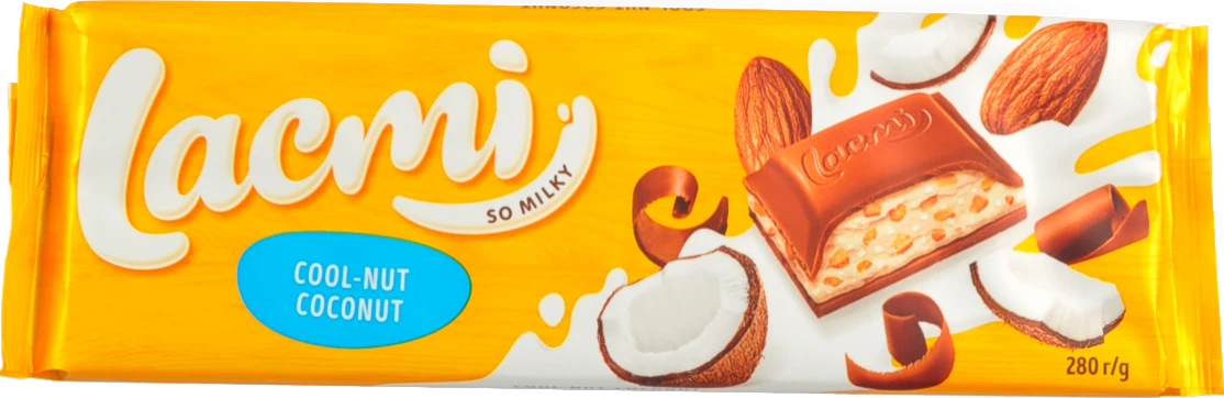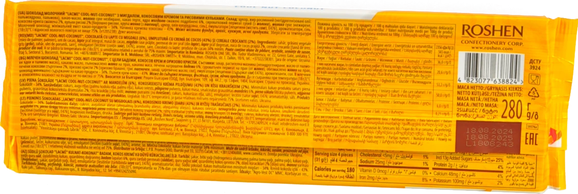 - Шоколад молочний з мигдалем кокосовим кремом та рисовими кульками Cool-Nut Coconut Lacmi Roshen м/у 280г
