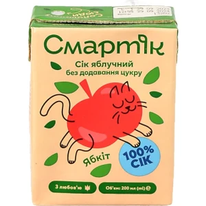 - Сік відновлений освітлений та пастеризований яблучний Смартік т/п 200мл