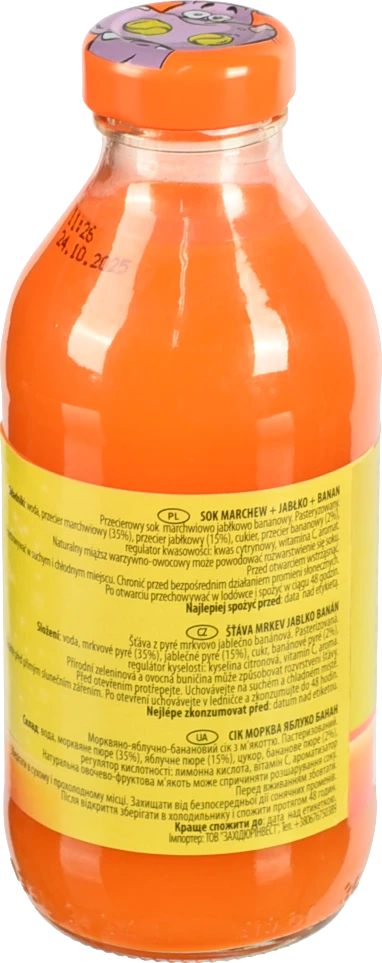 Смак:Моркв’яно-яблучно-банановий, ніжний, солодкуватий, з м’якою фруктово-овочевою ноткою