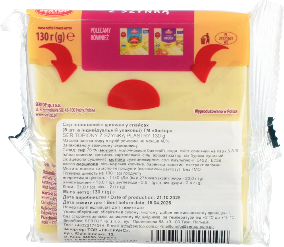 - Сир плавлений з шинкою у слайсах (8 шт., 130 г) ТМ «Sertop»
