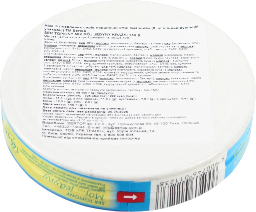 - Мікс із плавлених сирів порційний «Мій смачний» (8 шт., ТМ «Sertop»), 140 г