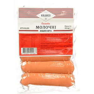 - Сосиски Kolbaso з молоком охолоджені, першого ґатунку, вакуумна упаковка, 420 г