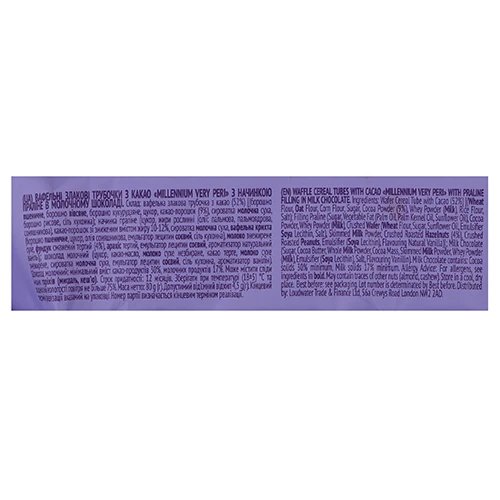 - Вафельні трубочки Millennium 80г very peri злак какао праліне молочний шоколад