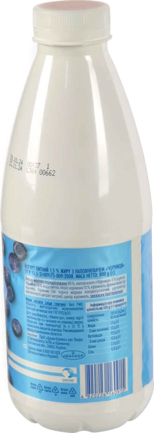 - Йогурт 1.5% питний Чорниця Danone п/пл 800г